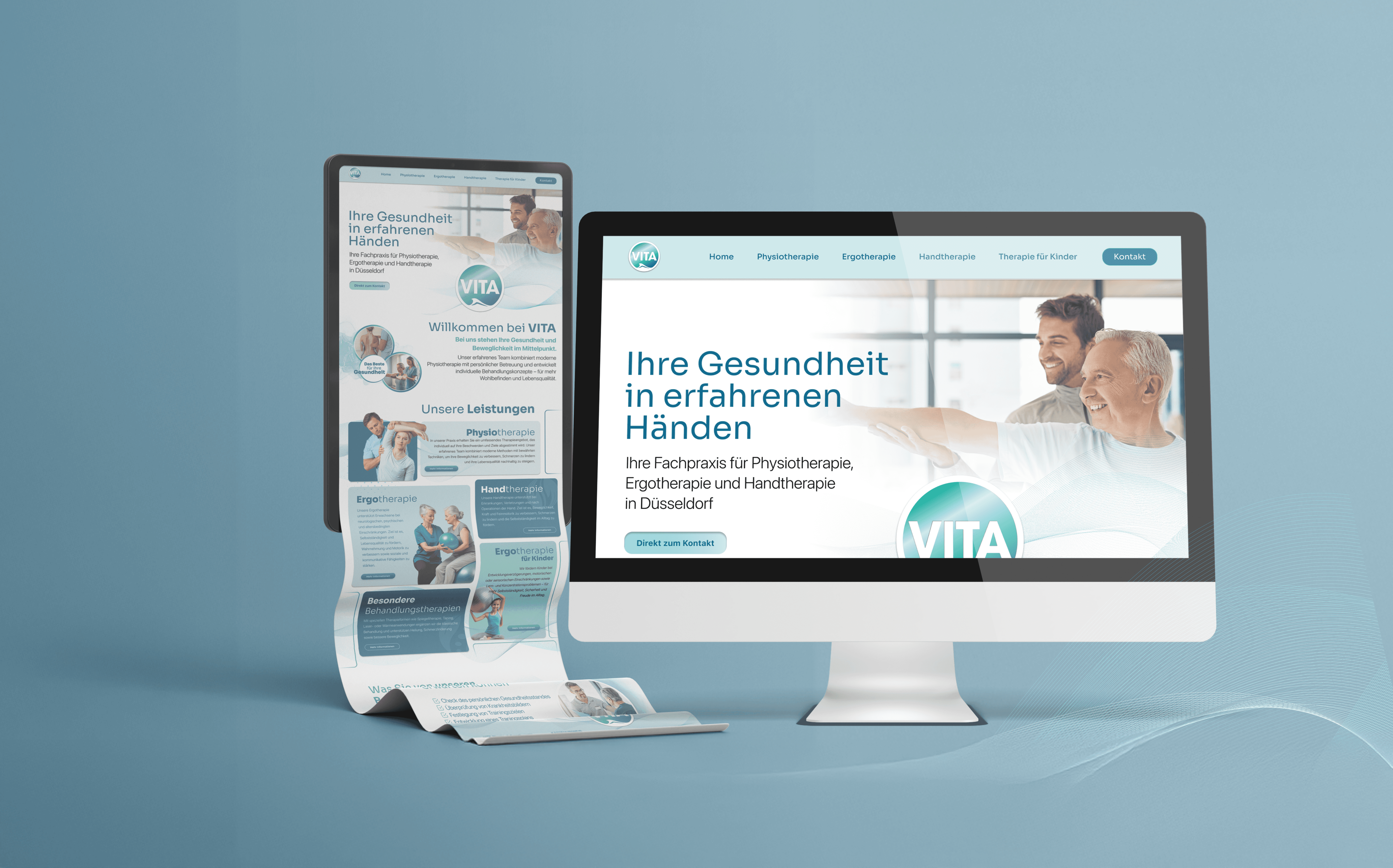 Die VITA Physiopraxis in Düsseldorf befand sich in einer Phase der Weiterentwicklung und wollte ihren Außenauftritt an den hohen Anspruch ihrer Leistungen anpassen. Das bestehende Erscheinungsbild wirkte visuell nicht mehr zeitgemäß und spiegelte weder die Professionalität noch die moderne Ausrichtung der Praxis wider. Sowohl im Printbereich als auch digital und innerhalb der Praxis fehlte eine klare gestalterische Linie, die für Wiedererkennbarkeit und Vertrauen sorgt.